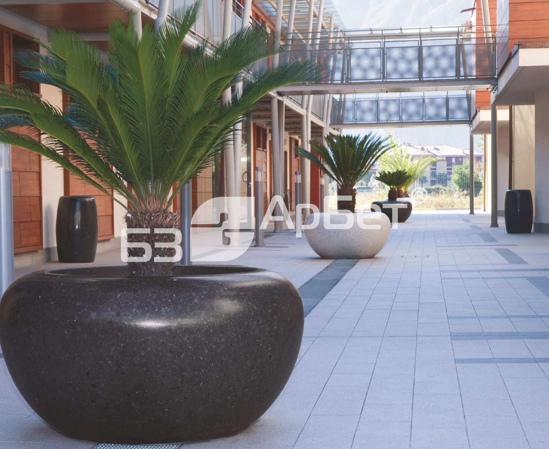 Цветочные вазоны ДЖОВЕ Цветочный вазон, модель "ДЖОВЕ", выполнен из качественного архитектурного бетона с добавлением каменной крошки. С помощью автоматической шлифовки достигается идеально гладкая поверхность, которая подчеркивает красоту природного камня.